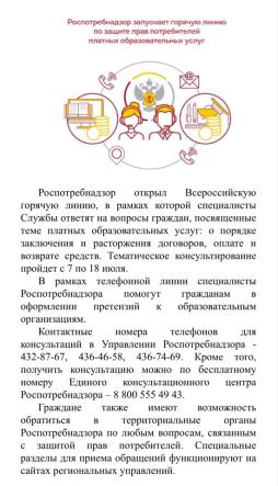 Роспотребнадзор открыл Всероссийскую горячую линию, посвященную теме платных образовательных услуг. Тематическое консультирование пройдет с 7 по 18 июля. Контактные номера телефонов- 436-8767, 436-45-58, 436-74-69. Бесплатный номер - 88005554943.